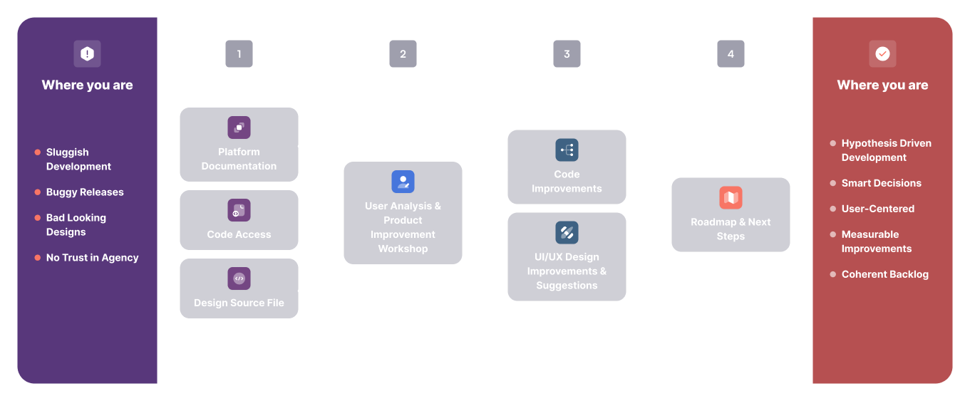 It helps diagnose common issues through a UX/UI audit, a codebase review, and a hard look at business and tech alignment.