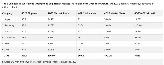 “While we saw some strong growth from low-end Android players like Transsion and Xiaomi in the second half of 2023, stemming from rapid growth in emerging markets, the biggest winner is Apple,” said Nabila Popal, research director with IDC's Worldwide Tracker team.