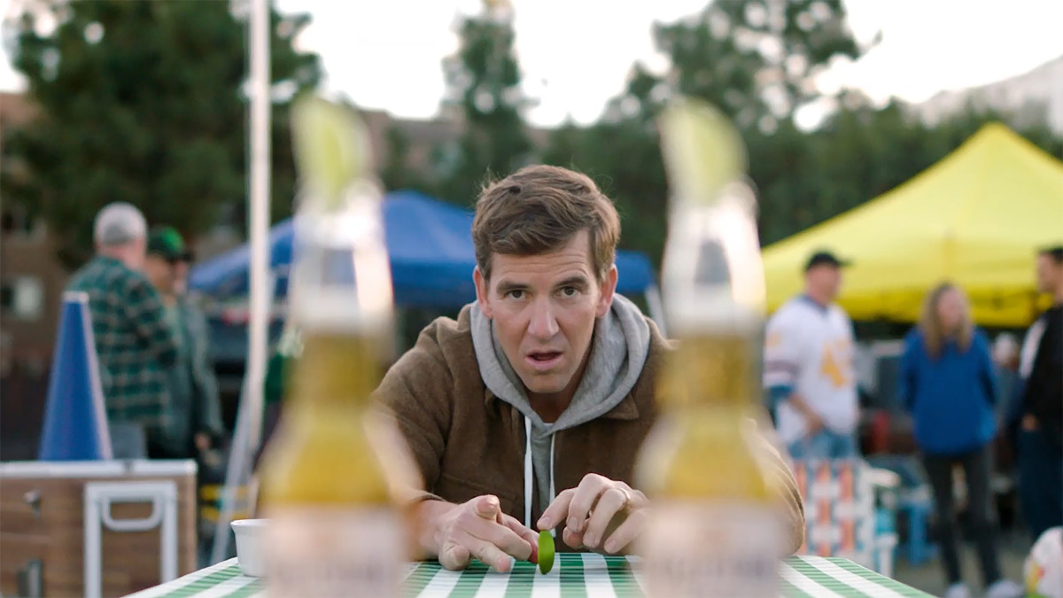 From across the table, Manning lines up a lime wedge for a perfect shot as dramatic music swells in the background.
