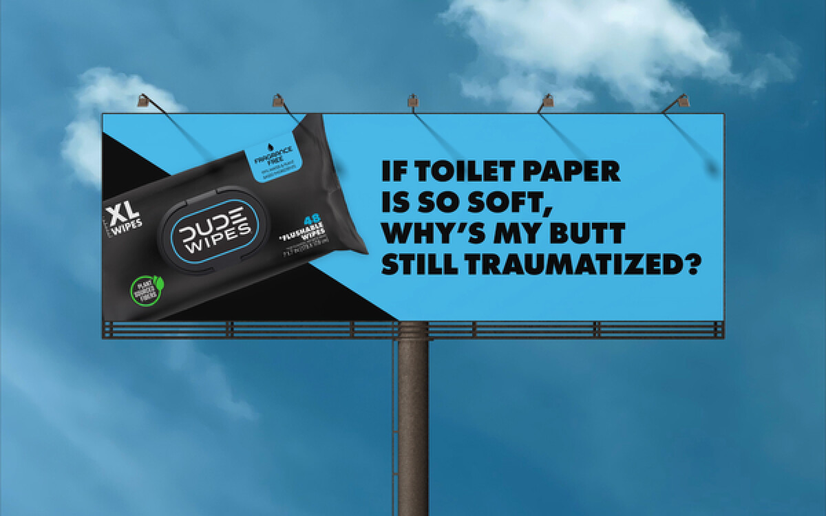 - Billboards use humor-driven lines to position DUDE Wipes as a modern alternative.