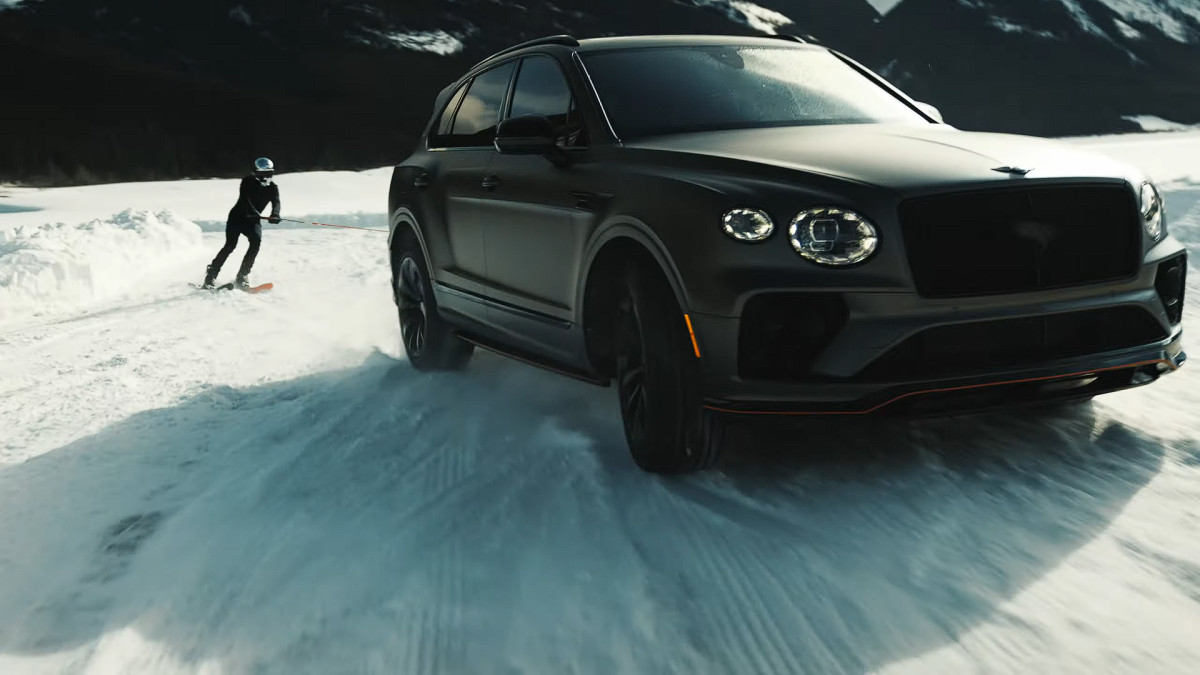 After pushing an elevator button, the first person steps out onto a snow-covered mountainside. He skis across a massive stretch of snow, pulled forward by a black Bentley.