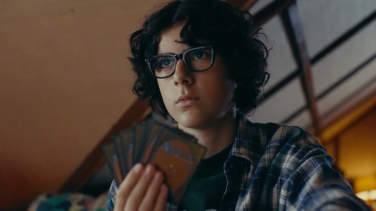 A flashback takes him to a card shop from his youth, where he holds his first pack of MTG cards.