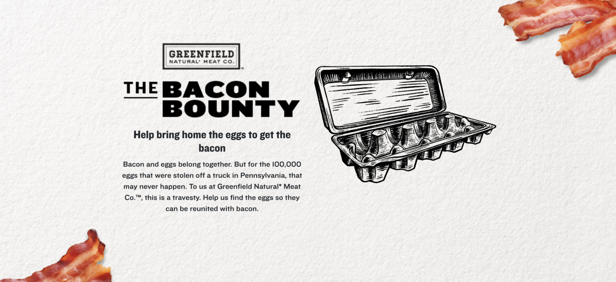 "Bacon and eggs were meant to be together. So when we heard about the theft of 100,000 eggs in Pennsylvania, Greenfield Natural Meat Co., makers of the best, raised without antibiotics bacon out there, we knew we had to step up and help.