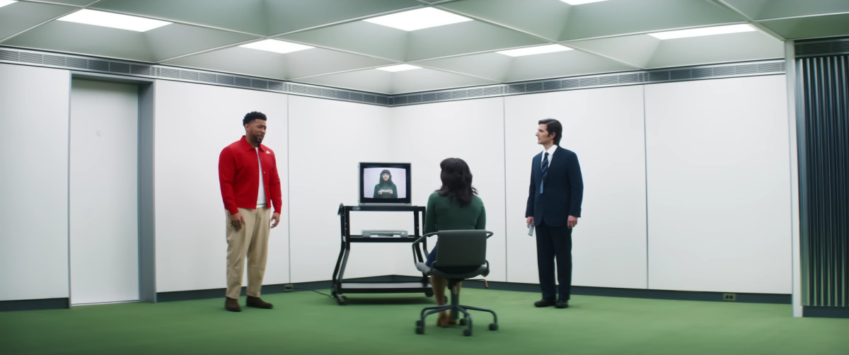 Disoriented, she's greeted by Adam Scott's character Mark, who shows her a video of herself agreeing to undergo the "Severance" procedure.