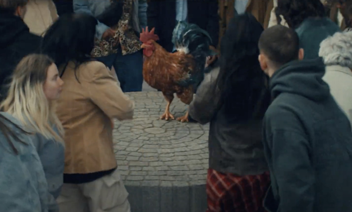 One by one, they drop what they’re doing and get infected by the chicken dance, slowly gathering and moving toward a location where, lo and behold, a chicken is grooving to the music, surrounded by people.