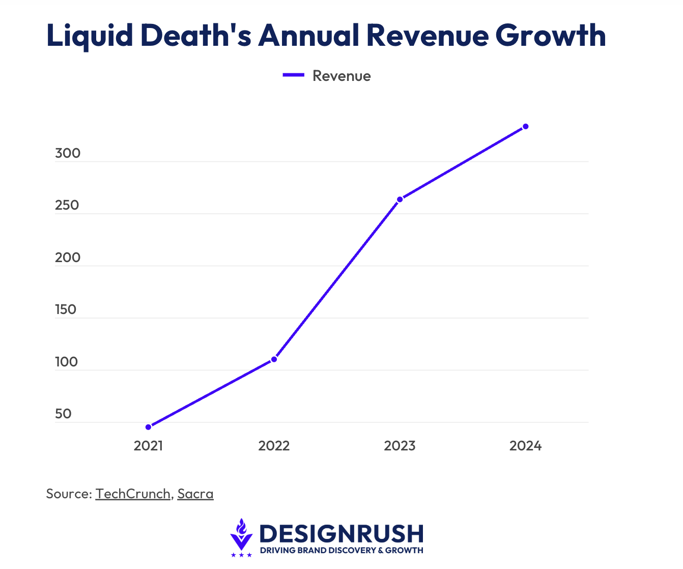 Liquid Death's brand revenue has grown from $45 million in 2021 to $333 million in 2024.
