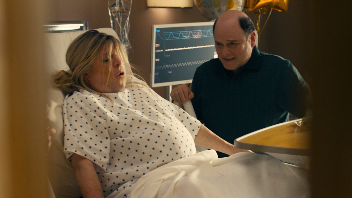 It all happens in a hospital's delivery room, where the characters get distracted by Mike's Amazing and pastrami sandwiches instead of focusing on the woman giving birth, whom he also plays.