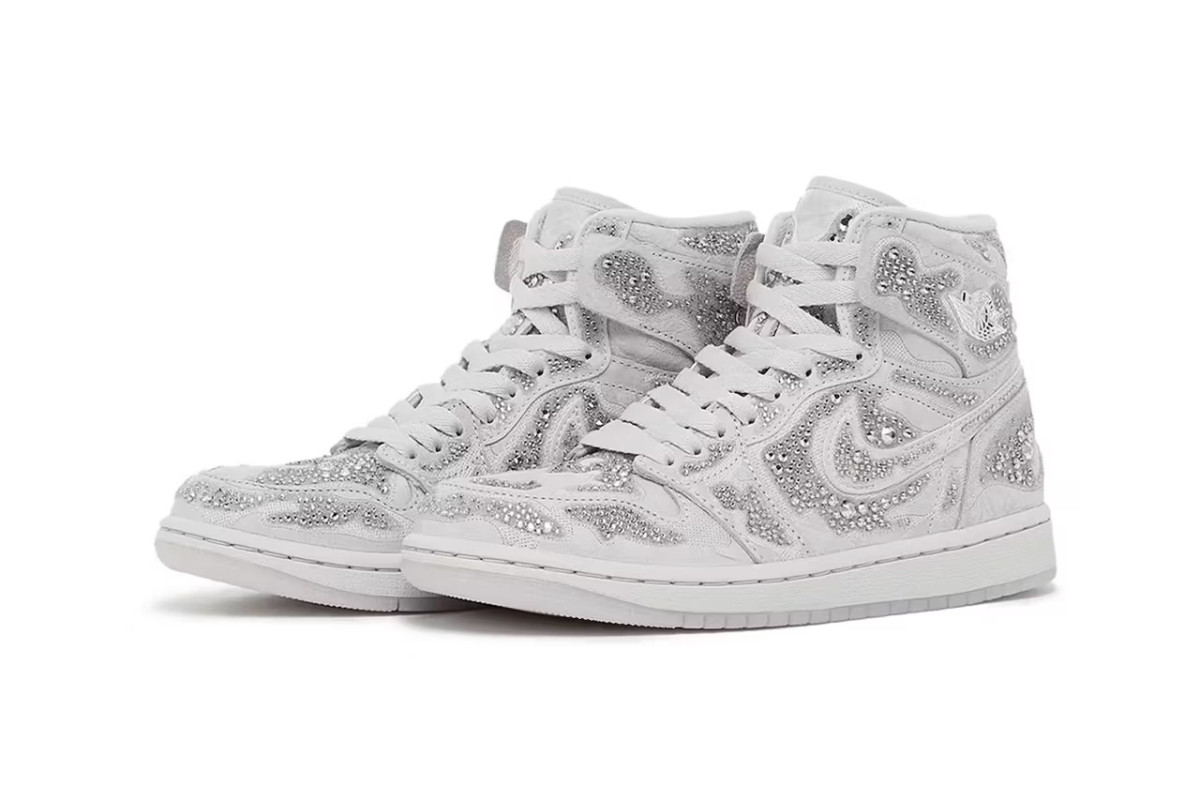 The shoe itself is a women’s Air Jordan 1 High OG in Vast Grey, covered in clusters of silver Swarovski crystals and sold at $1,005.