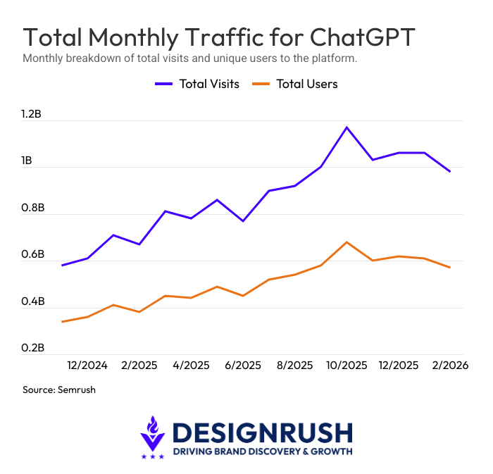 According to Semrush, the platform drew nearly 1 billion monthly visits through early 2026. A March 2026 study by Semrush also has ChatGPT as the fifth most visited website globally.