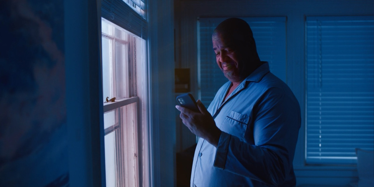 The 30-second commercial begins with a man lying awake in bed at 3 a.m., his room illuminated by the glaring glow of Christmas lights outside his window.