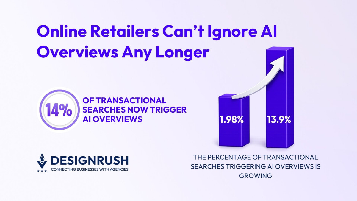 - Transactional queries now trigger AI Overviews nearly 14% of the time, marking a nearly 600% year-over-year jump.