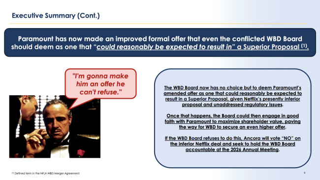 The firm also argued that WBD should consider the Paramount offer, with an image of Marlon Brando declaring, "I'm gonna make him an offer he can't refuse."