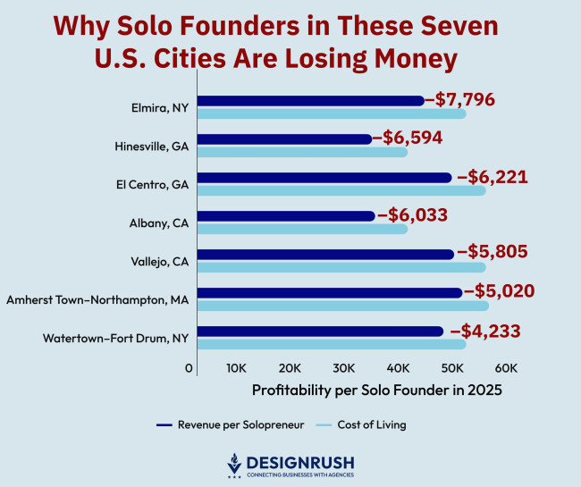 Elmira ranks dead last in 2025. The average solo founder loses $7,796 yearly, the largest in the country.